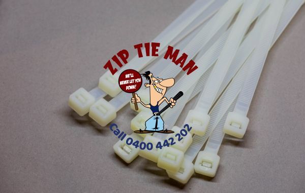 Zip Tie Man white cable ties are manufactured from nylon66 and have a flammability rating of UL94 class V2 and each size has been strength tested to beat all standards. Zip Tie Man cable ties will exceed expectations.